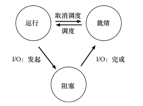 阻塞(blocked):在阻塞状态下,一个进程执行了某种操作,直到发生其他事件时才会准备运行。 一个常见的例子是, 当进程向磁盘发起 I/O 请求时, 它会被阻塞,因此其他进程可以使用处理器